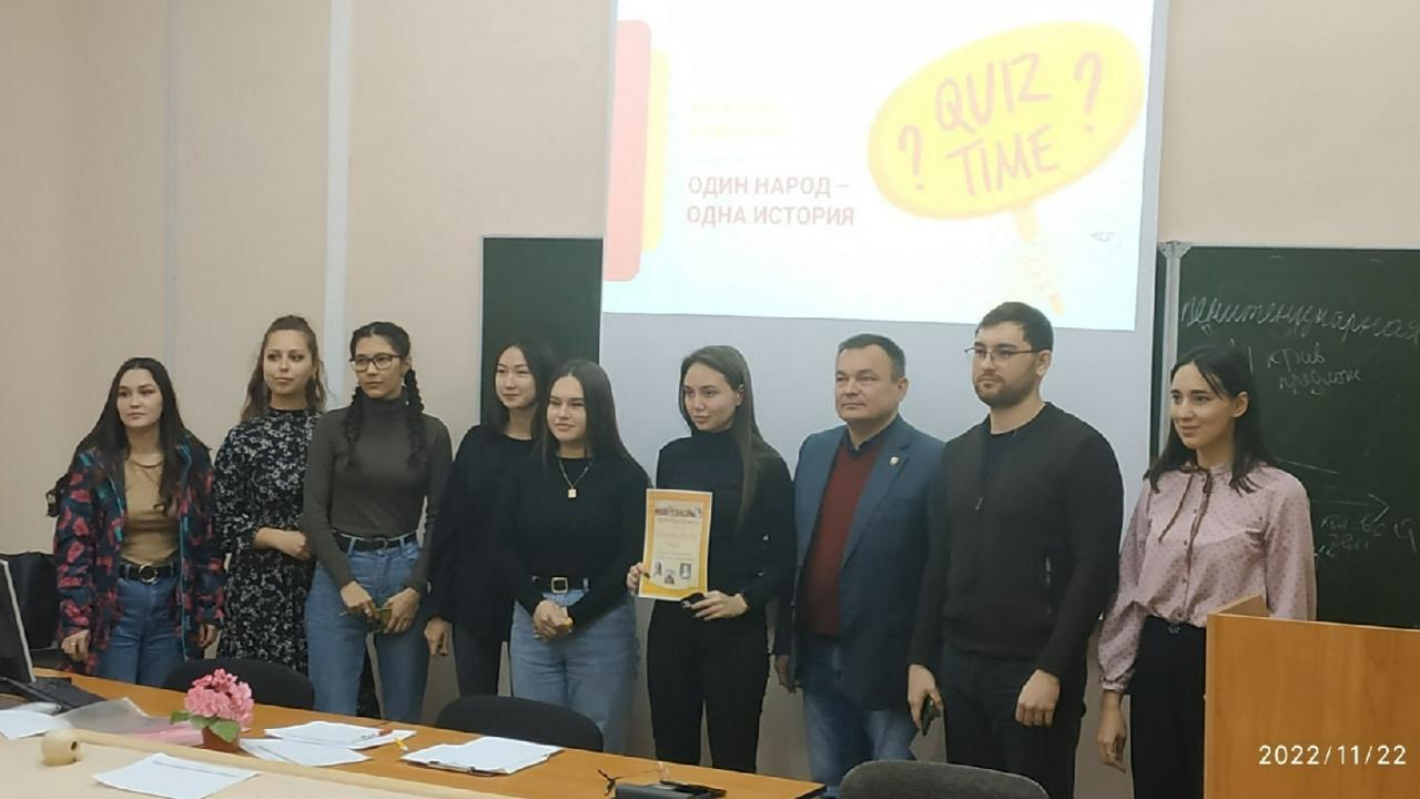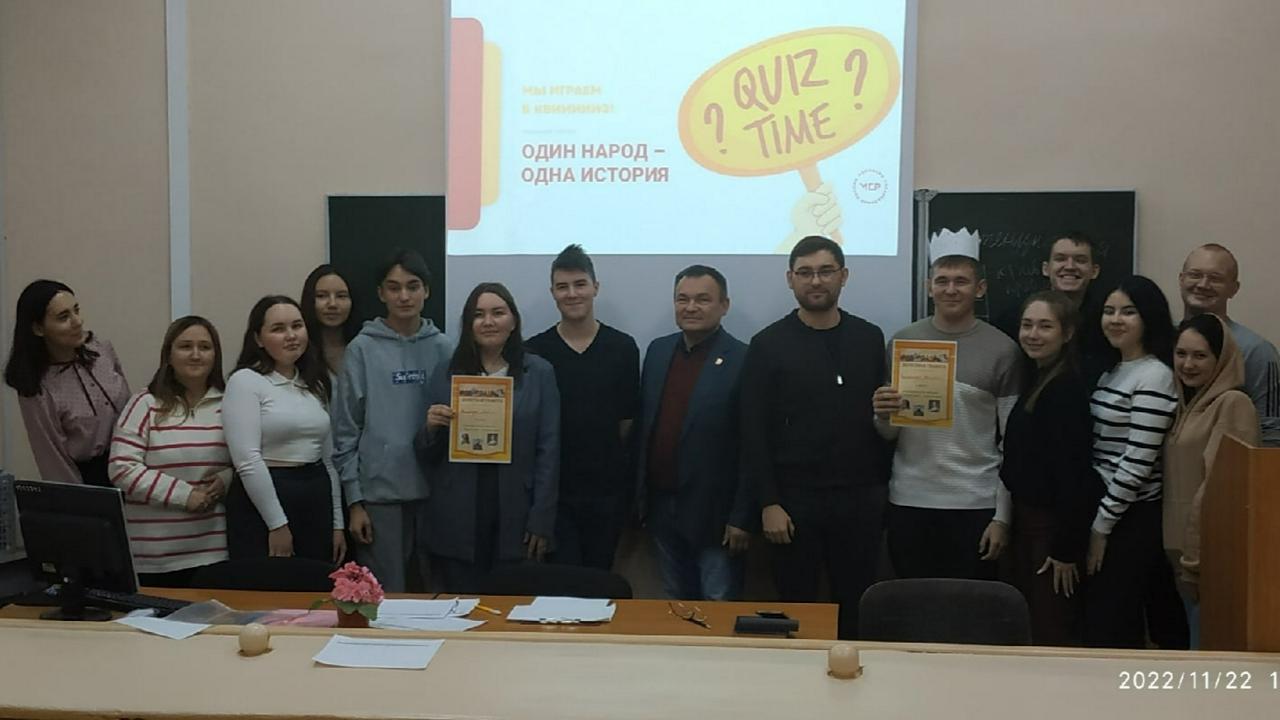 22 ноября в БФ УУНиТ был проведен исторический квиз "Один народ – одна история", в котором приняли участие студенты 1-4 курсов социально-гуманитарного факультета. Организатором квиза стало региональное отделение Общероссийской общественной организации политического просвещения и инициатив "Молодёжь СПРАВЕДЛИВОЙ РОССИИ" в Республике Башкортостан. Исторический квиз «Один народ - одна история» идёт по всей РБ и его цель состоит в формирование у студентов любви к своей Родине, чувства гордости за Родину и народ, уважения к его великими свершением.