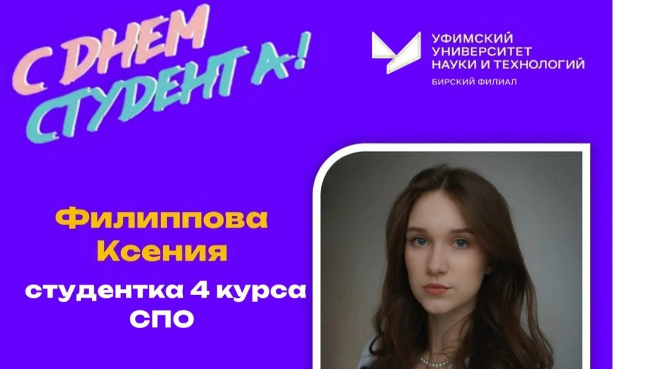 Филиппова Ксения — воплощение разностороннего успеха. Отличница, председатель студсовета общежития №5, талантливая танцовщица на «Студенческой весне», волонтёр (МАУ ОКДПМ «Космос») и будущий медиалидер, прошедший школу журналистики «Информационный спецназ». Её энергия и вовлечённость заряжают всех вокруг!