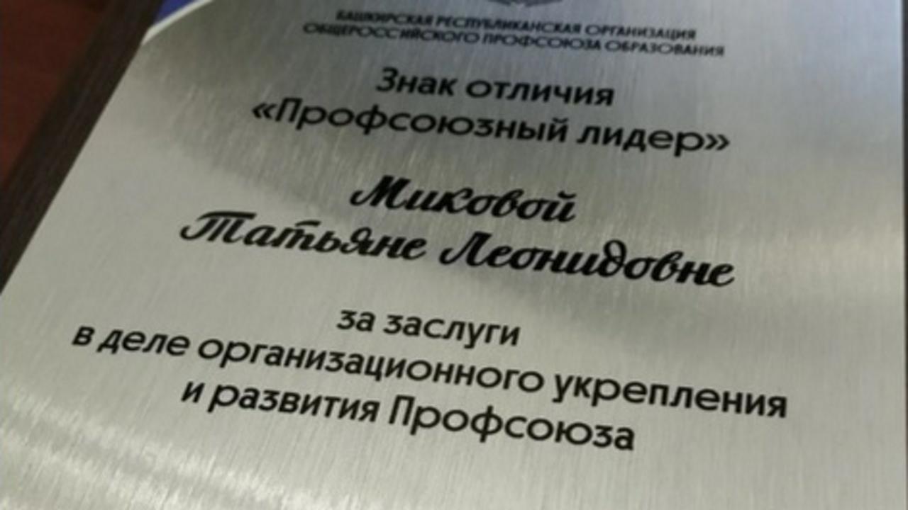 Председатель объединённой первичной профсоюзной организации Бирского филиала Уфимского университета науки и технологий Татьяна Леонидовна Микова была награждена знаком отличия «Профсоюзный лидер». Высокая награда вручена за заслуги в организационном укреплении и развитии профсоюзного движения.